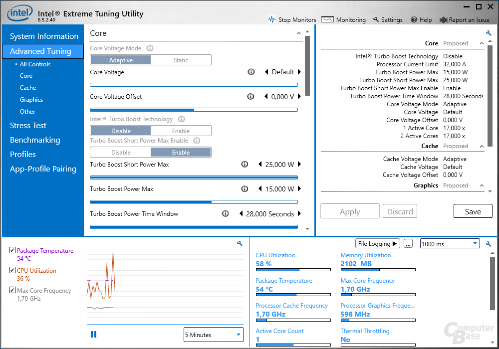 官方表示,新 XTU 支持对每核心单独设置 OC TVB 超频选项,可以保证在温度不超过警戒值的时候,尽可能释放性能。此外,还可以对整个芯片进行 OC TVB 调整,移除了 Benchmark 1.0 跑分中集成 HWBot 数据上传功能,为 Benchmark 2.0 集成了 HWBot 功能。