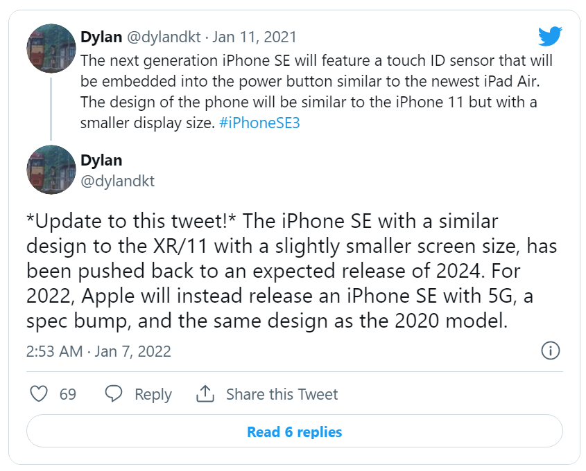 1 月 7 日消息,爆料人士 @Dylandkt 今天在推特称,即将到来的 2022 款苹果 iPhone SE 将支持 5G 网络,搭载新的 A 系列芯片,但不会有重大的设计变化,这与之前的一些新款 iPhone SE 的传言相一致。