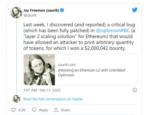 以太坊第二层扩展项目 Optimism 的开发人员称,这个 bug 本月早些时候被发现,目前已经打补丁修复。这个 bug 可以让黑客在 Optimism 账户余额中随心所欲地创造出更多的以太币(ETH)。