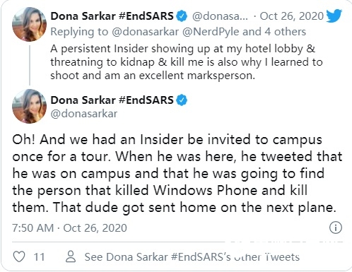 Sarkar还表示,“哦!还有一次我们邀请了一位Insider来园区参观。当他在这里的时候,他在推特上表示,已经在园区里,他要找到杀死Windows Phone的人,并杀死他们。那位老兄搭乘下一班飞机被送回了家。”