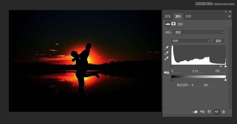 第三步:点击图层下面的“创建新的填充或调整图层”,选择“色阶”,把白色的滑块向左拖,如下图,使光线更加强烈。Alt+Ctrl+G,为这一图层创建剪贴蒙板。