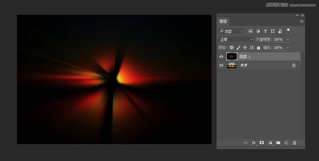 第二步:选择菜单栏的“滤镜”—"模糊"—“径向模糊”,Ctrl+F,重复两次,让光效更柔和。把图层中的“模式”改为“滤色”