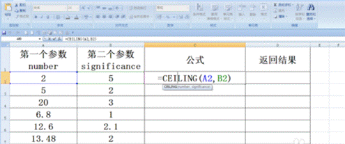 例如:下图中,为便于理解,我们在A列罗列出第一个参数number,B列为第二个参数significance,C列为公式,把返回结果放在D列。
