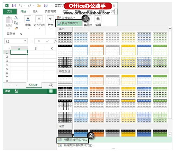 1、打开“开始”选项卡,在“样式”组中单击“套用表格格式”按钮,在下拉列表中选择“新建表格样式”选项,如图1所示。