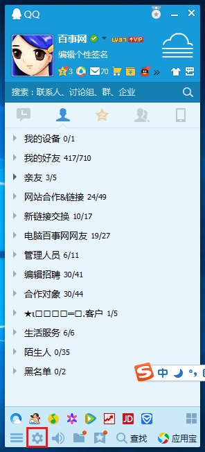 如果是QQ设置了关闭声音,也会出现QQ群没有提示音,解决办法是点击QQ面板底部的【设置】图标按钮,进入QQ设置,如图所示。