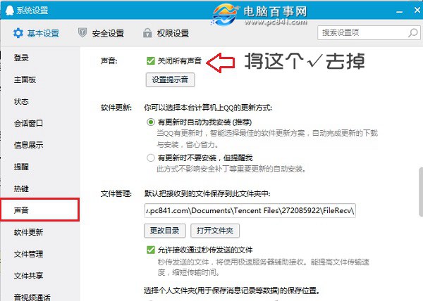 打开QQ系统设置后,点击左侧的“声音”选项,然后这个时候通常会发现,声音选项那里勾选了“关闭所有声音”,我们只需要把前面这个勾去掉,就可以了,如图。