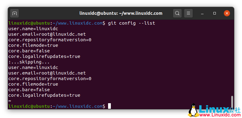 linuxidc@ubuntu:~/www.linuxidc.com$ git config –list