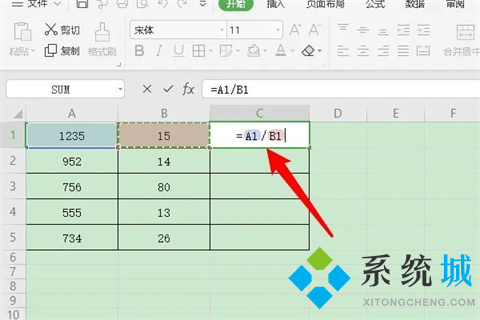 3、随后用鼠标选中A1,再输入【/】,再选中B1。