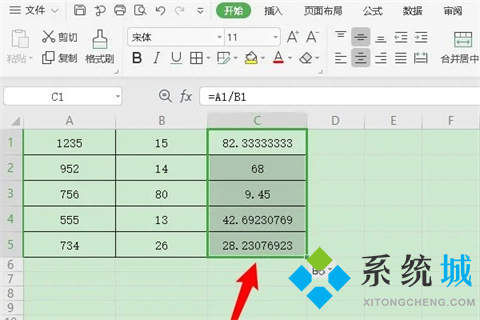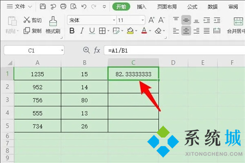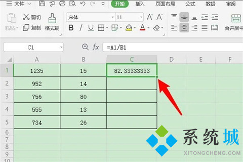 4、之后单击键盘上的回车键,C1单元格除法结果计算成功。