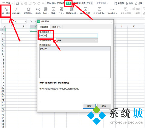 选中C1单元格,在“公式”点击“插入函数”,在“插入函数”界面中输入“IMDIV函数”,点击菜单中的“IMDIV函数”。然后在“函数参数”界面中计算就可以了。