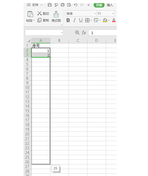 1、打开excel文档,找到想要下拉排序的表格区间,在区间第一格填入数字“1”,第二格填入“2”。