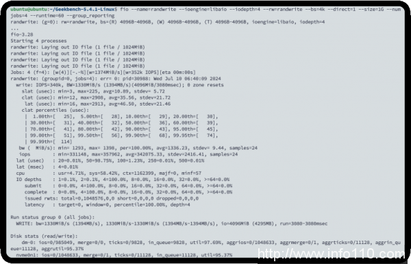 • 带宽:稳定在 1330 MiB/s(每秒 1394 MB)