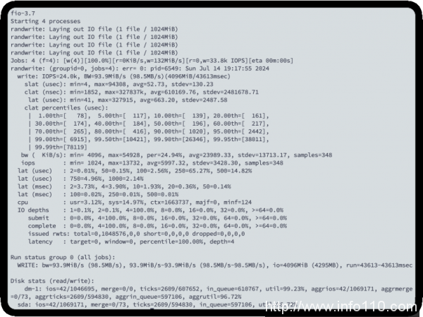 我们使用 fio 工具进行了随机写入测试,以下是详细数据: